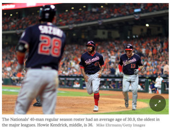 In baseball, as in other sports including my own (distance running), and as in much of life in general, age brings inevitable physical decline that eventually diminishes one’s ability to compete – but only in a few very specific ways. Looking more holistically at a person as they age, I’d argue that growing older actually improves our ability to perform. With more years of experience inside the intensity of the major leagues, these players gain perspective. Anything can happen in a game. Veterans who have lasted have learned to control their tempers and find outlets that don’t let a bad call ruin their game (or get them kicked out of it). It’s a long season. Playing that hard for 162 games is punishing on a body with any level of fitness, and finishing strong requires some pacing. The players that made up the two World Series teams this year are a diverse mix of ages and backgrounds, and represent the “sweet spot” in baseball, where one’s physical gifts have been trained with precision, and one’s cognitive gifts have been honed by experience. The New York Times ran a great story last week about “los viejos,” the group of older players on the Nationals who skew the team’s average age up, and refer to themselves as “the old men,” if you’d like to read more about them.