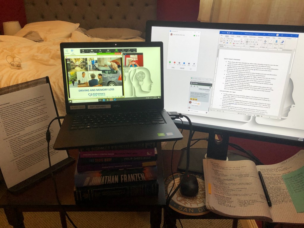 By any measure, we’re doing fine. Marc and I have stayed healthy, San Diego provides good weather for daily exercise outside, and we like each other’s company. Our small condo is ill-equipped for two people to work in all day – no matter how much they may like each other – with no office, private spaces, or even desks. But we have stable employment and a big dining table, so I’m calling it good. I’ve been utterly buried in the redevelopment of the community dementia education program at Alzheimer’s San Diego, which launched as an all-online program in late March and has been steadily building. I haven’t had more than a handful of days off since this all began, and am withering – but we’ve got a solid infrastructure in place now, and I think I’ve got a realistic sense of my capacity and a good road map for the months ahead. So now I’m looking forward to a little of this quarantine “down time” I keep hearing about.
